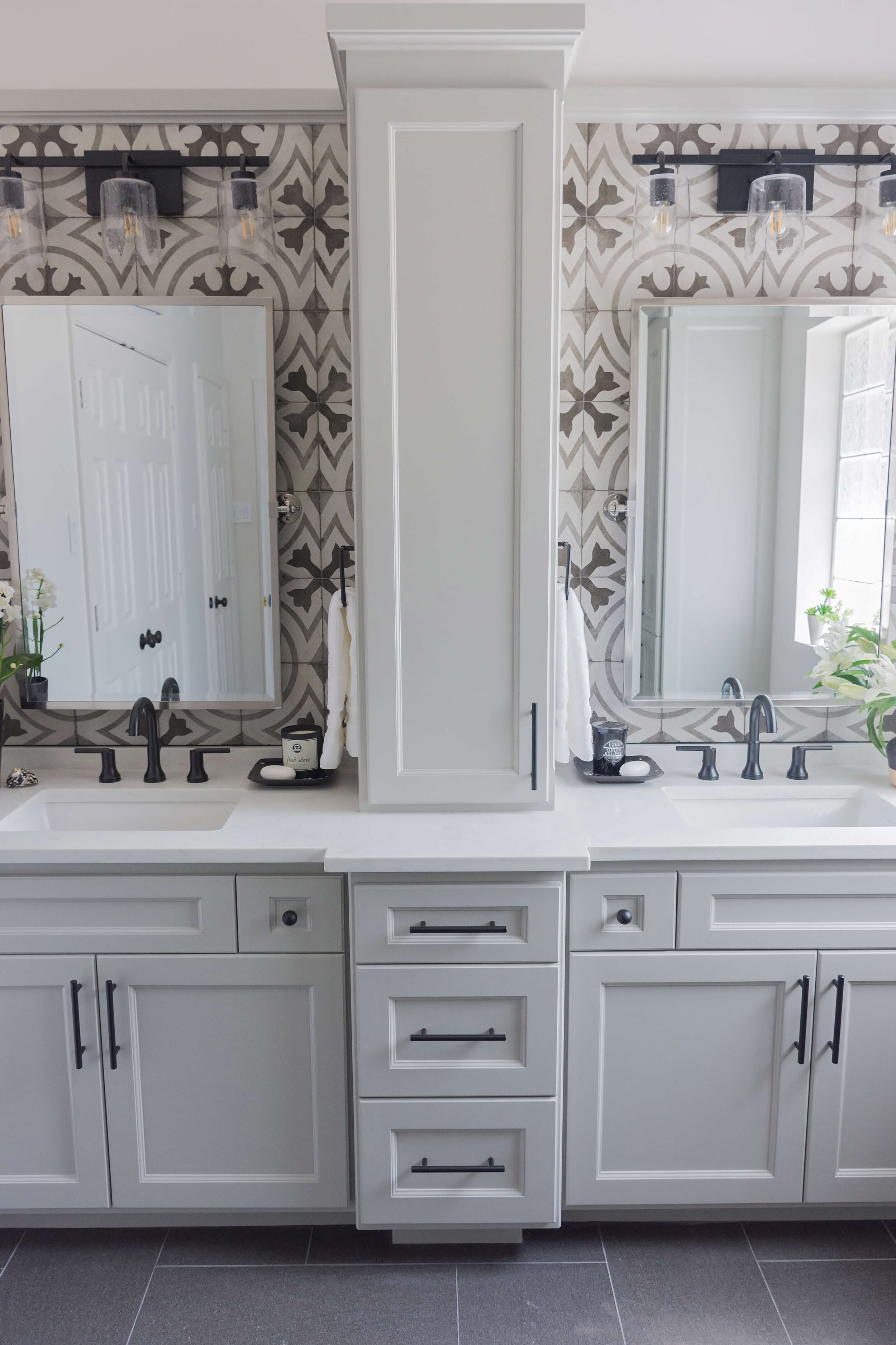 9 Ideas For The Space Between Double Sinks In The Bathroom from st.hzcdn.com Massive or understated, modern or traditional, decorative or plain practical: I was contacted by a reader who really liked the custom vanity designed for the rebel house but the reader asked that the vanity be longer, with more drawers. Faceted mirrors are quirky and intriguing paired with those amazing gold sconces. If you do not have enough space for a big bathroom vanity, you can try this bathroom vanity plan. Beautiful bathroom vanity design ideas begin with imagination. Shop from bathroom vanities, like the render bathroom vanity or the beverly bath vanity, while discovering new home products and designs. Let's talk about some of our best bathroom vanity, bathroom storage, and bathroom design ideas. This off white vanity offers a ton of storage space and pairs well with an elegant lighting fixture.
